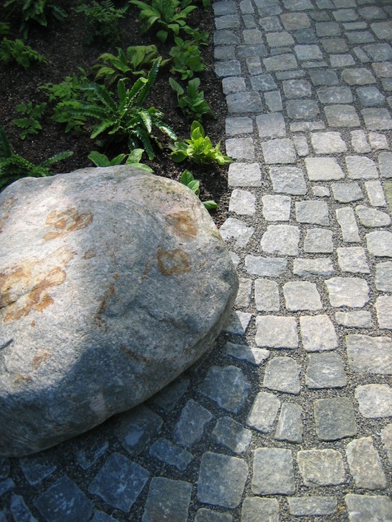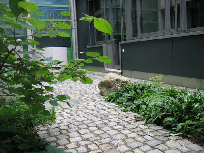 Der Innenhof wird als Freiraumlabor interpretiert. Die Einrichtungselemente als Inventar stellen im übertragenen Sinne eine Versuchsanordnung dar: Gestein - Boden - Pflanze - Totholz - Wasserbecken