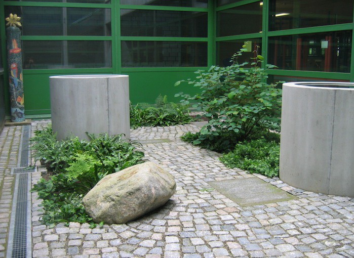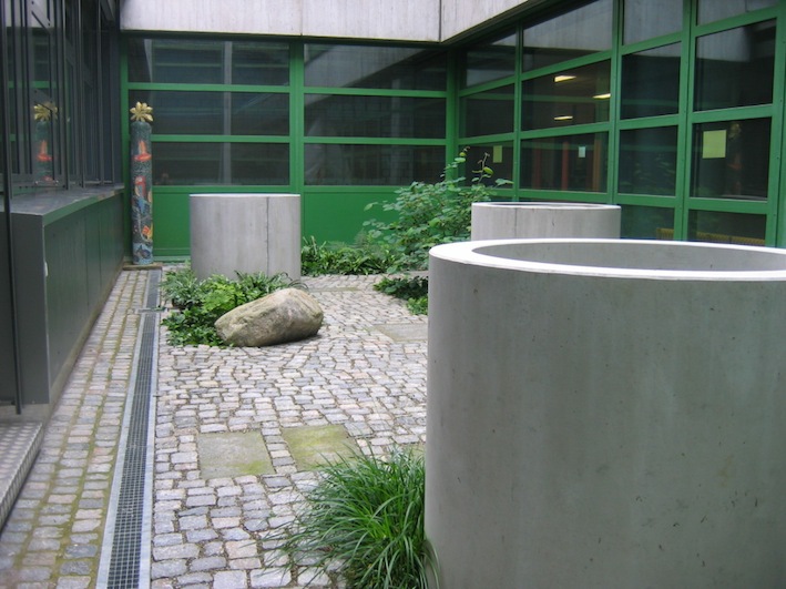 Diese Elemente sind in den Raum gestellt, werden mehr oder minder betreut, gepflegt, bewirtschaftet. Was sich daraus an Lebensformen und Lebensveränderungen im Laufe der Zeit entwickelt, wird beobachtbar und kann in den Unterricht oder die Anschauung der Schülerinnen und Schüler einfließen, die den Innenhofraum über den Lauf der Zeit beobachten und in der Lage sind, die stattfindenden Veränderungen zu registrieren.