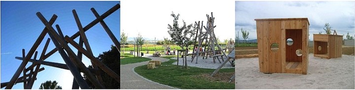 In der Mitte der Fläche enstand eine platzartige Aufweitung mit verschiedenen Sitzmöglichkeiten. Daran schließt zentral ein weitläufiger Sandbereich mit großer Holzstangenkonstruktion an. Schwingen, Beklettern, Balancieren, in den Netzen liegen und unter Mithilfe anderer neue Höhen ersteigen. Ein Kleinkinderbereich mit Spielkuben und altersgemäßer Spielausstattung schließt an den Aufenthaltsbereich an.